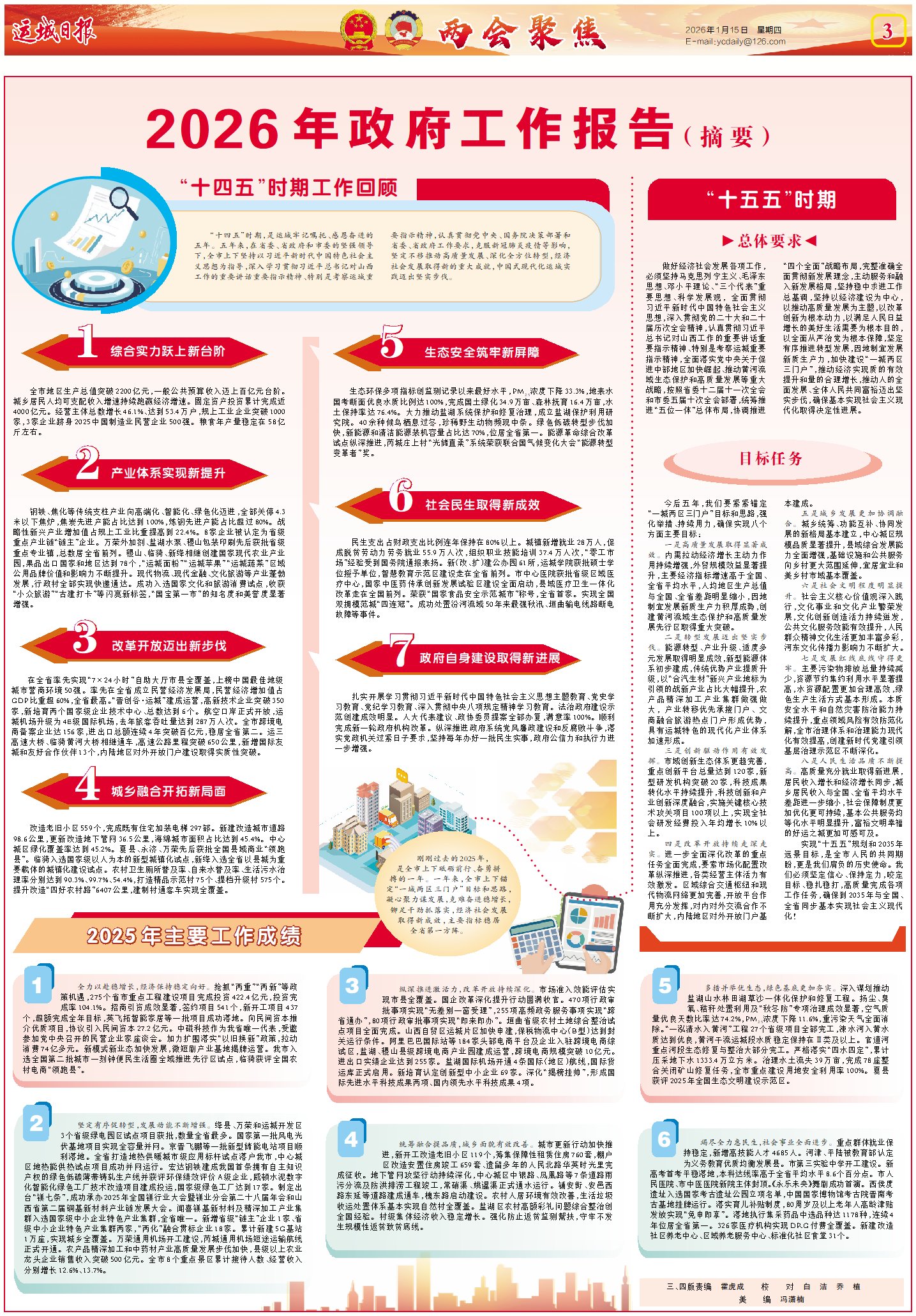 2坚定有序促转型,发展动能不断增强。绛县、万荣和运城开发区3个省级绿电园区试点项目获批,数量全省最多。国家第一批风电光伏基地项目实现全容量并网。京晋飞鹏等一批新型储能电站项目顺利落地。全省打造地热供暖城市级应用标杆试点落户我市,中心城区地热能供热试点项目成功并网运行。宏达钢铁建成我国首条拥有自主知识产权的绿色低碳薄带铸轧生产线并获评环保绩效评价A级企业,威顿水泥数字化智能化绿色工厂技术改造项目建成投运,国家级绿色工厂达到17家。制定出台“镁七条”,成功承办2025年全国镁行业大会暨镁业分会第二十八届年会和山西省第二届铜基新材料产业链发展大会。闻喜镁基新材料及精深加工产业集群入选国家级中小企业特色产业集群,全省唯一。新增省级“链主”企业1家、省级中小企业特色产业集群两家,“两化”融合贯标企业18家。累计新建5G基站1万座,实现城乡全覆盖。万荣通用机场开工建设,芮城通用机场短途运输航线正式开通。农产品精深加工和中药材产业高质量发展步伐加快,县级以上农业龙头企业销售收入突破500亿元。全市8个重点景区累计接待人数、经营收入分别增长12.6%、13.7%。