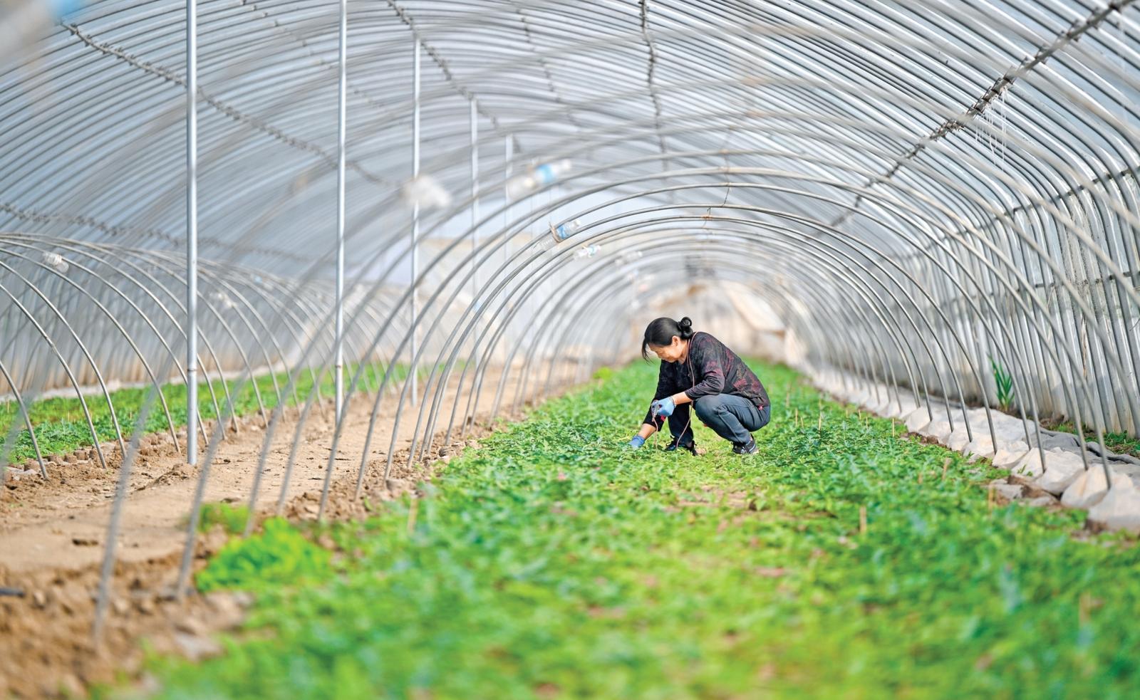 3月18日,在永济市虞乡镇洗马村西瓜大棚内,瓜农在对瓜秧进行科学管护。