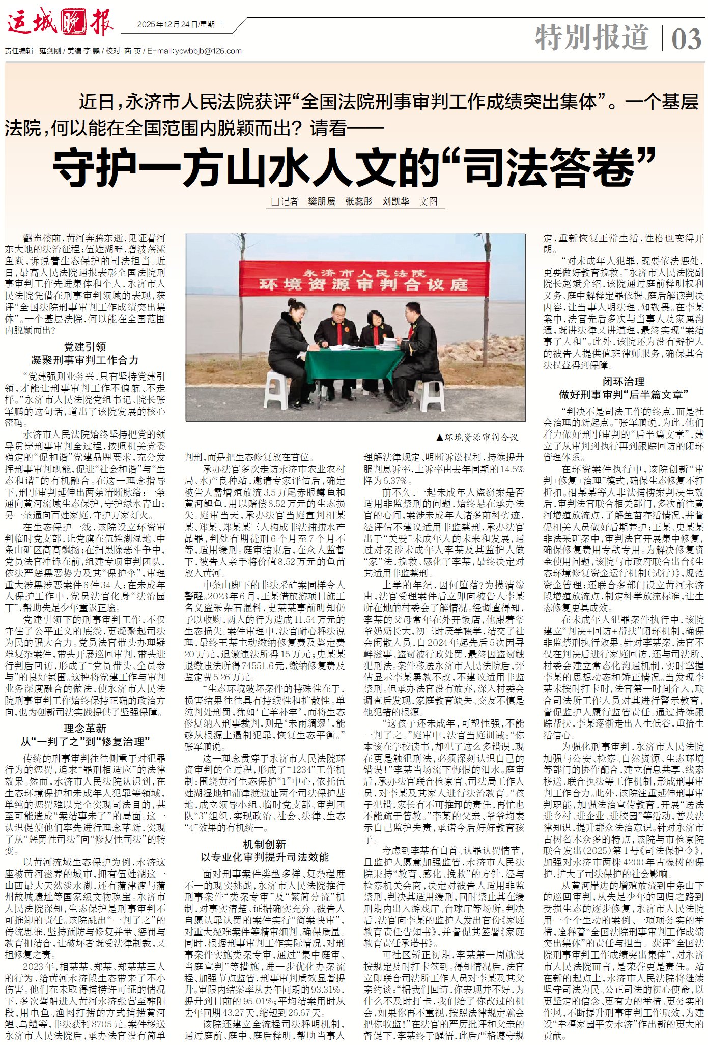 永济市人民法院始终坚持把党的领导贯穿刑事审判全过程,按照机关党委确定的“促和谐”党建品牌要求,充分发挥刑事审判职能,促进“社会和谐”与“生态和谐”的有机融合。在这一理念指导下,刑事审判延伸出两条清晰脉络:一条通向黄河流域生态保护,守护绿水青山;另一条通向百姓家庭,守护万家灯火。
