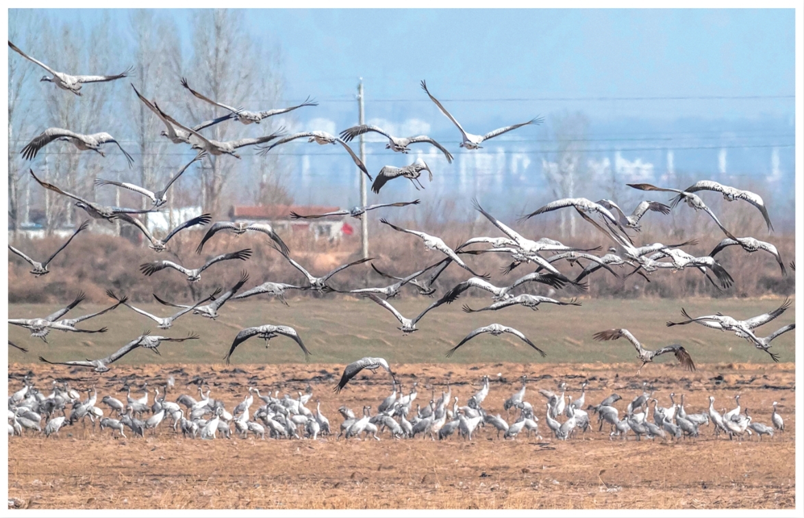 ▶1月13日,成群的灰鹤在尽情嬉戏、飞翔,给冬季的黄河湿地注入了生机与活力。